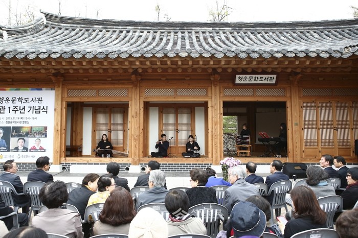 | ▲ '청운문학도서관 개관 1주년 기념식'에서 연주자들이 악기를 연주하고 있다. | ||