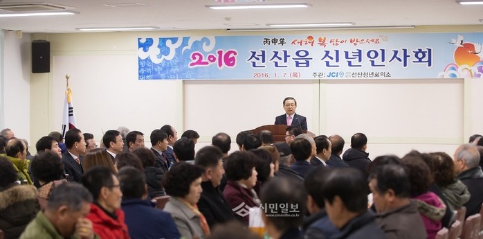 경북 구미시 선산읍은 지난 7일 읍사무소 2층 회의실에서 주민 300여명이 참석한 가운데 '2016년 신년인사회'를 개최했다. 사진은 행사에 참석한 남유진 시장이 신년사를 하는 모습.(사진제공=구미시청)