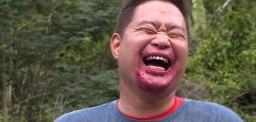현주엽은 당시 방송에서 용과라는 열매를 먹은 후 빨간 입주변을 드러내며 호탕하게 웃고있다.