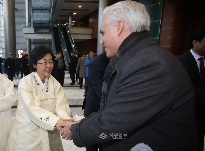 강남구는 지난 8일 오후 3시 코엑스에서 '2016 강남구 신년인사회'를 진행했다. 사진은 행사에 참석한 신연희 구청장이 외국인과 인사를 나누는 모습.(사진제공=강남구청)