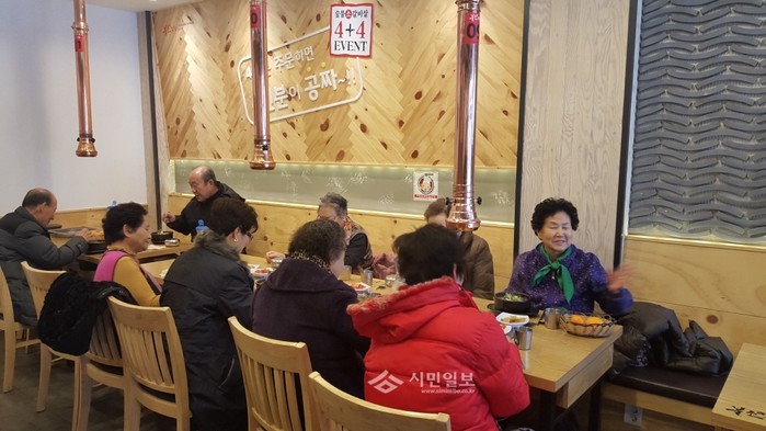 경기 동두천시 송내동에 위치한 불소식당에서는 지난 8일 지역내 경로당 노인 10여명을 초청해 따뜻한 점심식사를 대접했다. 사진은 행사에 참석한 노인들이 식사를 하는 모습.(사진제공=동두천시청)