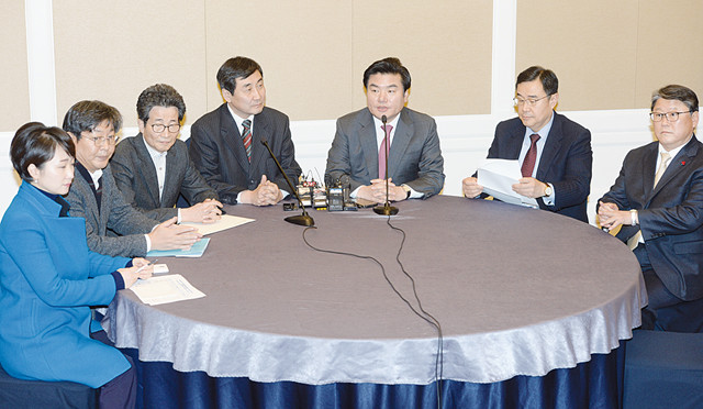 11일 오전 서울 여의도 국회에서 열린 여야 3+3회동에 참석한 새누리당 원유철 원내대표, 김정훈 정책위의장, 조원진 원내수석부대표와 더불어민주당 이종걸 원내대표, 이목희 정책위의장, 이춘석 원내수석부대표, 이언주 원내대변인이 회의를 갖고 있다.