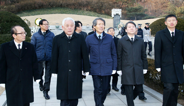 ‘국민의당’ 한상진 공동창당준비위원장과 안철수, 김한길 의원 등이 11일 오전 서울 동작구 국립서울현충원 박정희 전 대통령 묘소를 참배한 뒤 이동하고 있다.