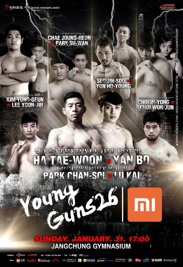 모두 12명의 영건스 파이터들이 출전하는 이번 '샤오미 로드FC 영건스 26'의 메인이벤트는 하태운과 얀보의 대결이다. 하태운은 6승 1패 1무의 성적을 거두고 있으며 중국의 얀보는 이번 대회 출전 선수들 중 최연소다.