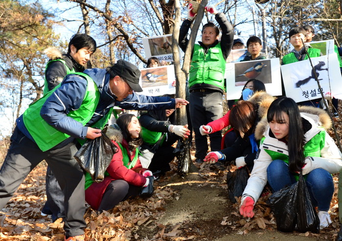 서울 중랑구에 있는 묵동환경감시단이 지난 10일 오전 봉화산에서 겨울철 야생동물 먹이주기, 새집달기 행사를 열고 야생동물의 먹이를 뿌리고 있다. / 뉴시스