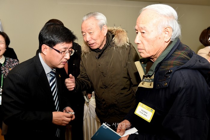 노원구가 최근 월계2동 주민센터에서 '동(洞) 신년인사회'를 개최한 가운데 김성환 구청장(왼쪽)이 참석한 노인에게 지역현안을 경청하고 있다.(사진제공=노원구청)