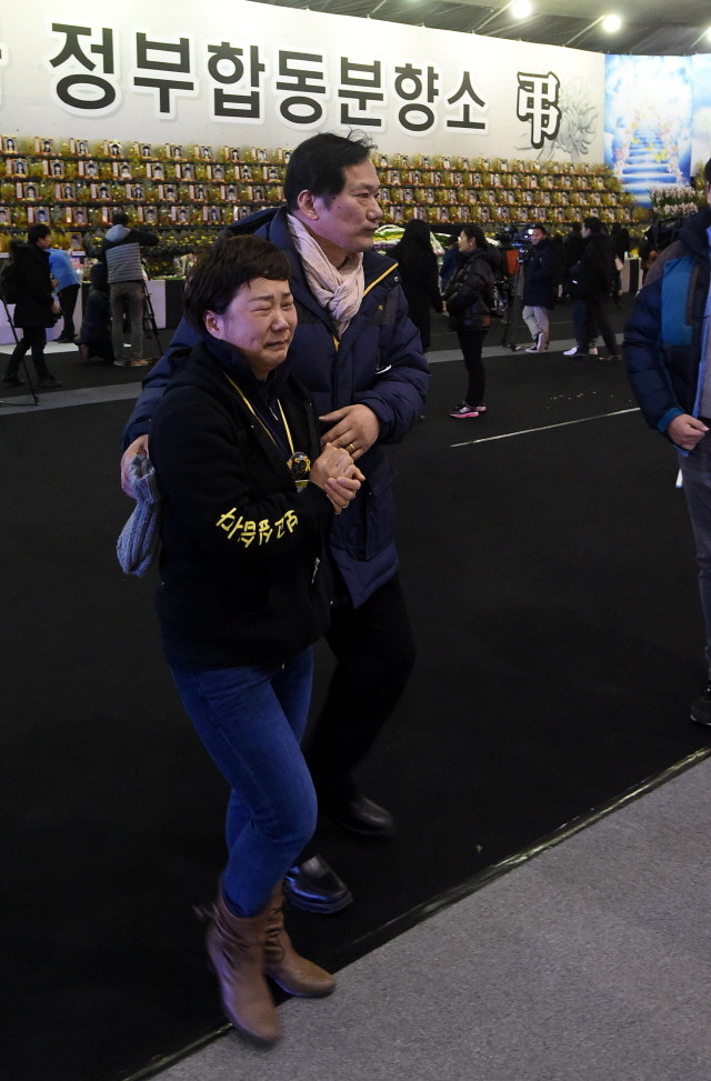 12일 오후 경기도 안산시 세월호참사 희생자 정부합동분향소에서 유가족들이 눈물을 흘리고 있다.