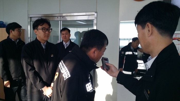 경기 여주소방서는 지난 12일 엄정한 공직기강 확립을 위한 '불시 자체음주단속 측정'을 실시했다. 사진은 소방서 관계자들이 음주측정기를 불고 있는 모습.(사진제공=여주소방서)