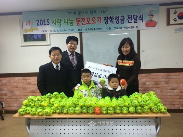 지난 12일 서울 구로구 오류2동 7개 민간어린이집 원아들이 지난해 10~12월‘사랑나눔 동전 모으기’ 행사를 통해 돼지저금통에 모은 동전을 구로구 오류2동장학회에 기부했다.(사진제공=구로구청)