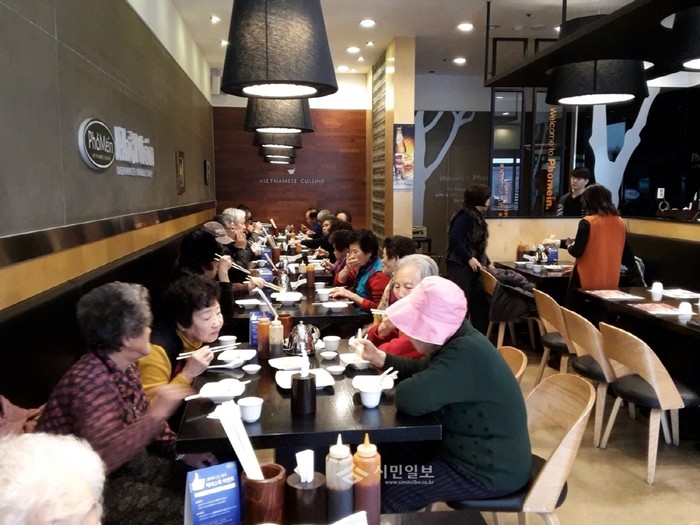지난 11일 경기 부천시 상2동에 소재한 쌀국수 전문식당 포메인은 심곡3동 홀몸노인 22명에게 점심식사를 제공하는 행복잔치를 열었다. 사진은 행사에 참석한 노인들이 식사를 하는 모습.(사진제공=부천시청)
