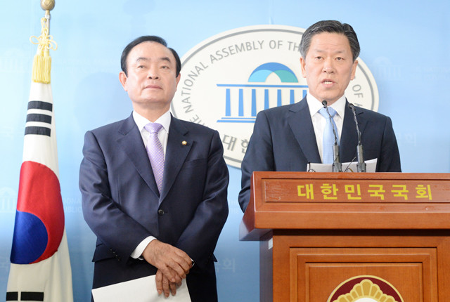 더불어민주당 주승용 최고위원과 장병완(왼쪽) 의원이 13일 오전 서울 여의도 국회 정론관에서 탈당 기자회견을 하고 있다.