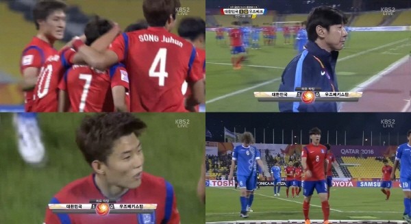 대표팀은 우즈베키스탄의 골문을 두드리던 중 전반 17분 황희찬이 왼쪽 측면으로 쇄도하는 과정에서 슈쿠로프가 핸들링 반칙을 범해 페널티킥이 선언되면서 결정적인 기회를 맞았다. 키커로 나선 문창진이 페널티킥을 성공시키면서 선제골을 기록했다.