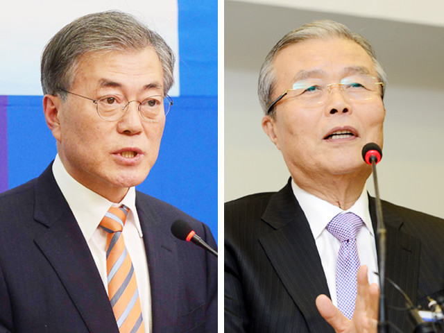 더불어민주당 문재인 대표가 14일 서울 여의도 국회에서 열린 긴급최고위원회의를 마친 후 기자회견을 열고 김종인 전 의원을 선대위원장으로 영입한다고 밝히고 있다(왼쪽). 오른쪽은 대통령실 경제수석비서관을 지낸 김종인 전 의원.