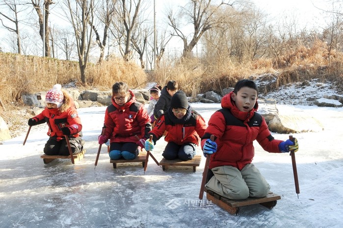 서울의 최저기온이 영하 8도를 기록한 지난 14일 오전 송파구 방이생태학습관에서 열린 '방이습지에서 놀자' 프로그램에 참가한 어린이들이 얼음썰매를 타며 즐거운 시간을 보내고 있다.(사진제공=송파구청)