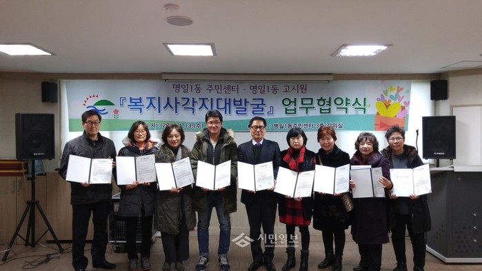 지난 13일 서울 강동구 명일1동은 복지사각지대에 있는 위기가구를 발굴하기 위한 네트워크를 구축하기 위해 동내 12곳의 고시원과 업무협약을 체결했다. 사진은 협약식에 참석한 관계자들이 기념촬영을 하는 모습.(사진제공=강동구청)