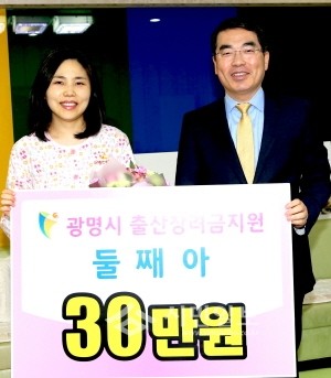 | ▲ 양기대 광명시장이 올해 첫 둘째아를 분만한 김희선 주부에게 출산장려금을 전달하고 포즈를 취하고 있다. | ||