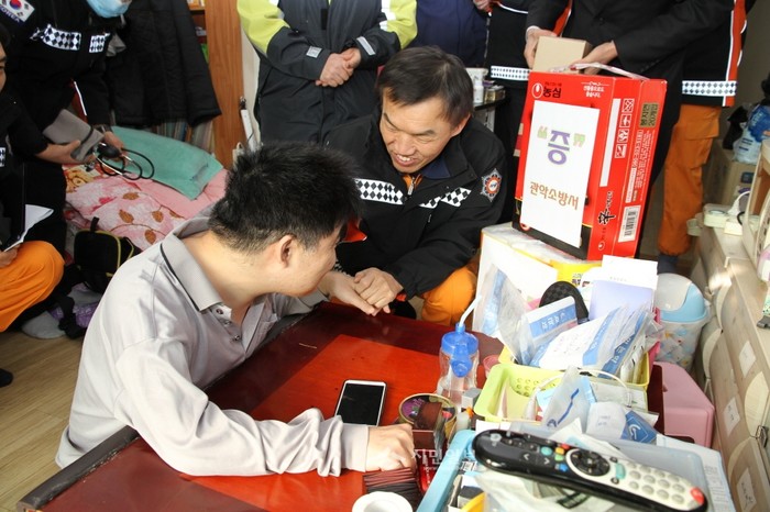 서울 관악소방서는 지난 15일 겨울철 한파피해의 선제적 대응을 위한 119방문 도움서비스의 일환으로 지역내 생활이 어려운 이웃을 방문했다. 사진은 황인환 서장이 관계자에게 생활용품을 전달하는 모습.(사진제공=관악소방서)