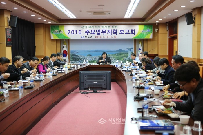 최근 신우철 전남 완도군수는 군청 회의실에서 ‘2016 주요업무계획 보고회’를 진행했다. 사진은 신 군수와 군청 관계자들이 도시락을 먹으며 회의를 하는 모습.(사진제공=완도군청)
