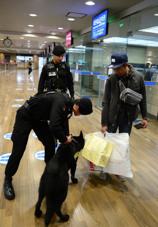 15일 오후 인천국제공항 입국심사장에서 공항경찰대 대원들이 폭발물 탐지견과 함께 경계근무를 서고 있다.