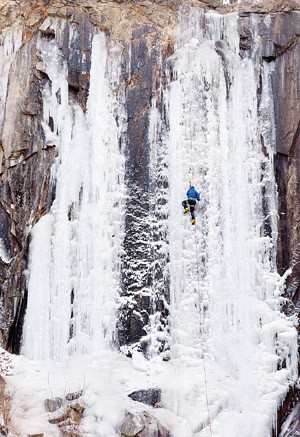 연일 동장군이 기승을 부리는 지난 15일 오전 경기도 양주시 가남면 가래비 빙벽장에서 클라이머가 빙벽을 오르고 있다. 경기도 양주시 광적면에 위치한 가래비 빙벽은 고거 채석장이던 곳에 계곡물이 흘러 자연 빙벽을 만들어 초급자 클라이머들이 즐겨찾는 장소이다.