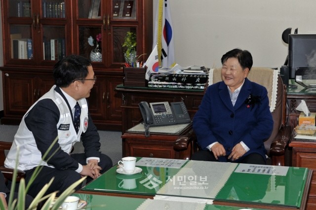 | ▲ 박정자 의장(오른쪽)이 대한적십자사 서울지사 관계자와 집무실에서 적십자 활동에 대한 사항들을 논의하고 있다.(사진제공=영등포구의회) | ||