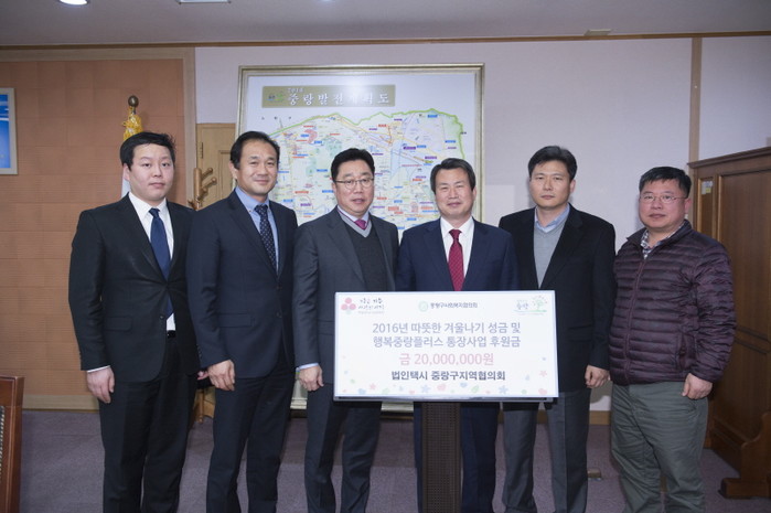 지난 15일 서울 중랑구는 ‘행복중랑플러스 통장사업 및 2016년 따뜻한 겨울나기’ 성금전달식을 진행했다. 사진은 나진구 구청장(오른쪽에서 세 번째)이 법인택시 중랑구지역협의회로부터 성금 2000만원을 전달받고 기념촬영을 하는 모습.(사진제공=중랑구청)