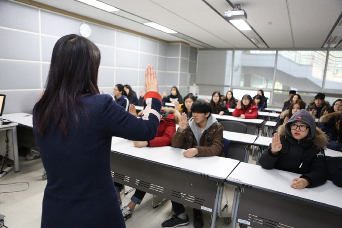 서울 금천구는 지난 15일 오후 2시 구청 평생학습관 3강의실에서 청소년 30여명을 대상으로 ‘청각장애인 인식개선 및 기초수화교육’을 진행했다. 사진은 수화를 배우는 청소년들의 모습.(사진제공=금천구청)