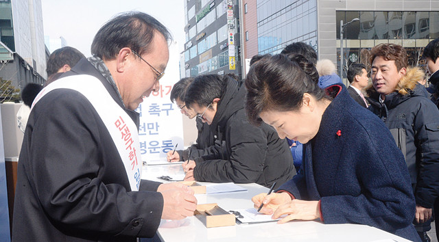 박근혜 대통령이 18일 오후 경기도 판교역 광장에서 열린 민생구하기 입법 촉구 천만 서명운동 행사장을 찾아 서명하고 있다.
