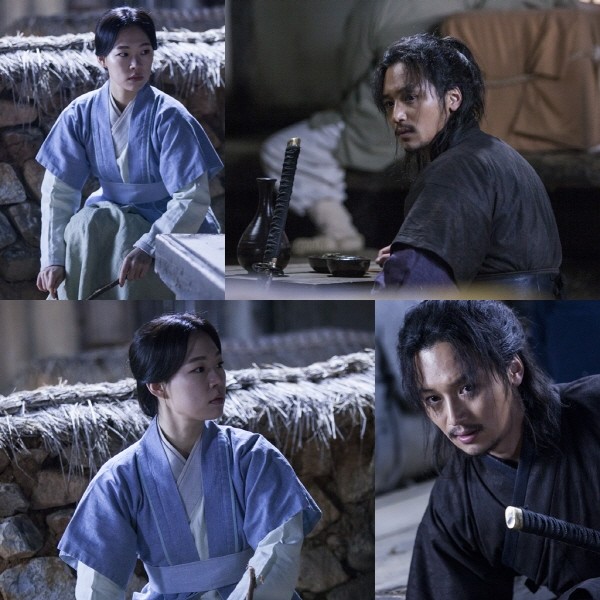 공개된 사진 속 이방지는 어두운 밤, 주막을 찾은 모습이다. 자리에 앉아 술잔을 기울이는 이방지 곁에는 그가 목숨처럼 소중히 여기는 칼이 우뚝 세워져 있다.