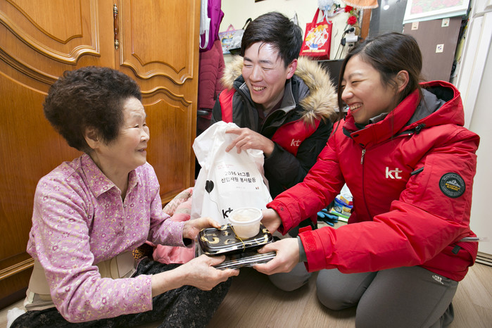 KT그룹 신입사원 300여명은 취약계층의 겨울 나기 지원을 위해 그룹차원의 대규모 봉사활동을 시행했다. 사진은 KT 그룹 신입사원이 동자동 쪽방촌 주민에게 도시락을 배달하는 모습