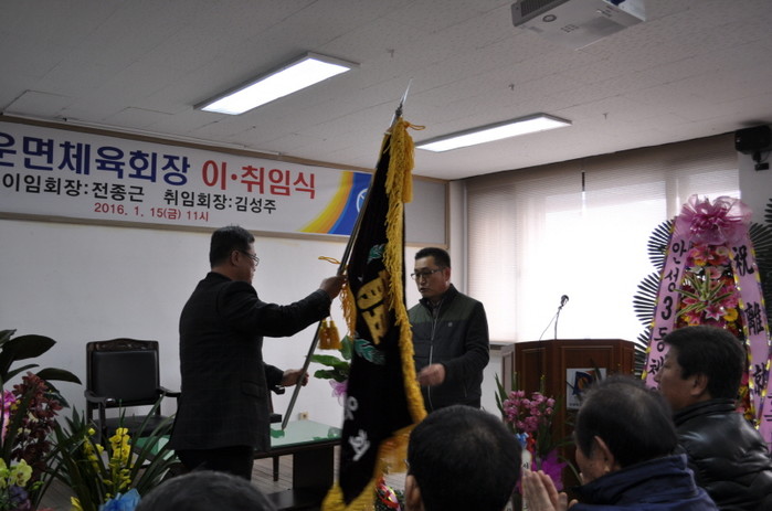 최근 경기 안성시 서운면사무소 회의실에서 서운면 체육발전을 위해 활동해온 전종근 체육회장과 새롭게 이끌어갈 김성주 체육회장의 이·취임식이 진행됐다.(사진제공=안성시청)