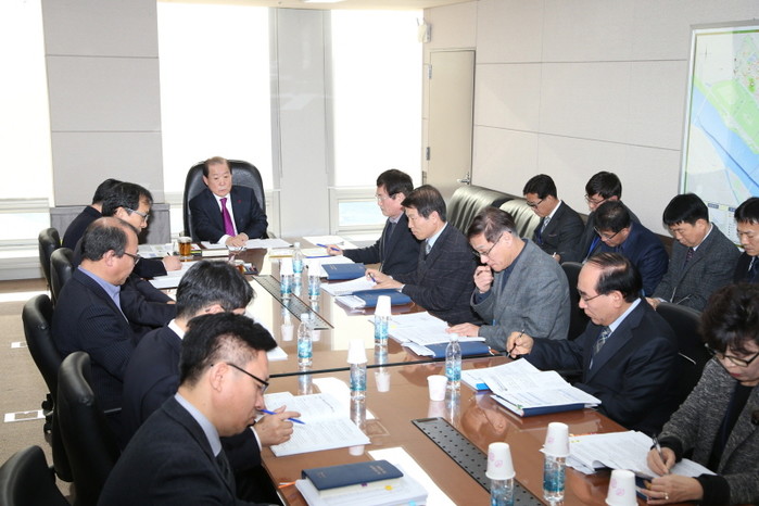 지난 18일 오후 마포구는 구청 집중회의실에서 ‘2016년도 주요업무 보고회’를 진행했다. 사진은 보고회에 참석한 박홍섭 구청장이 직원에게 보고를 받는 모습.(사진제공=마포구청)