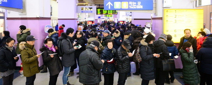설 기차표 예매가 시작된 19일 오전 동대구역에서 시민들이 기차표 예매를 위해 길게 줄지어 서 있다./ 뉴시스