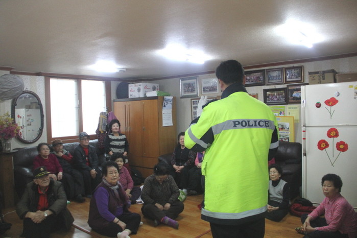 지난 19일 인천서부경찰서는 연희동 소재 노인정 3곳을 방문, 노인 80여명을 대상으로 교통사고 예방을 위한 맞춤형 안전교육을 실시했다. 사진은 경찰서 관계자가 교육을 진행하는 모습.(사진제공=인천서부경찰서)