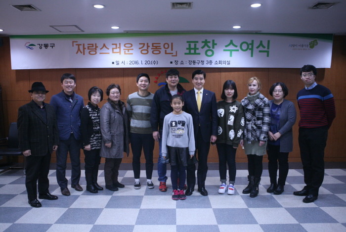 지난 20일 오후 2시 이해식 강동구청장(오른쪽에서 다섯 번째)은 구청 3층 소회의실에서 열린 '자랑스러운 강동인 표창'에 참석해 구민 12명에게 표창을 수여하고 격려했다.(사진제공=강동구청)