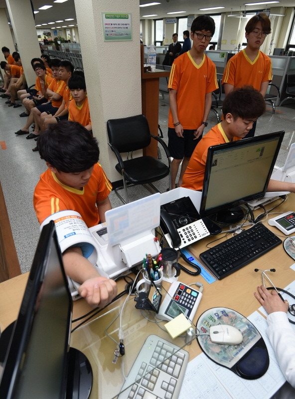 2016년도 첫 징병검사가 시행된 21일 오전 경기도 수원시 경인지방병무청에서 징병검사 대상자들이 신체검사를 받고 있다. /뉴시스
