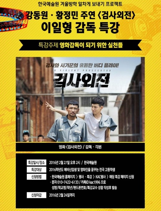 [시민일보=김다인 기자]4년제 예술학사 교육기관 한국예술원(학장 김형석)은 예비 신입생 및 전국 고등학생과 청소년을 대상으로 2월 27일 영화 ‘검사외전’의 이일형 감독 특강을 개최한다고 밝혔다.