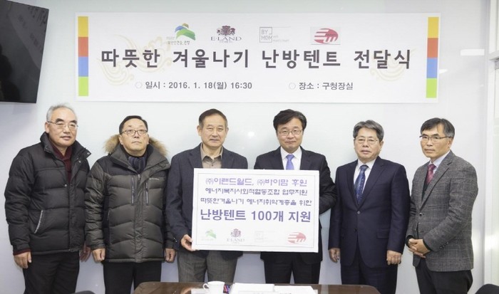 최근 서울 은평구는 (주)이랜드월드와 (주)바이맘이 후원하고 에너지복지사회적협동조합에서 추진하는 '따뜻한 겨울나기 난방텐트 전달식'을 진행했다. 사진은 김우영 구청장(오른쪽에서 세 번째)과 관계자들이 기념촬영을 하는 모습.(사진제공=은평구청)