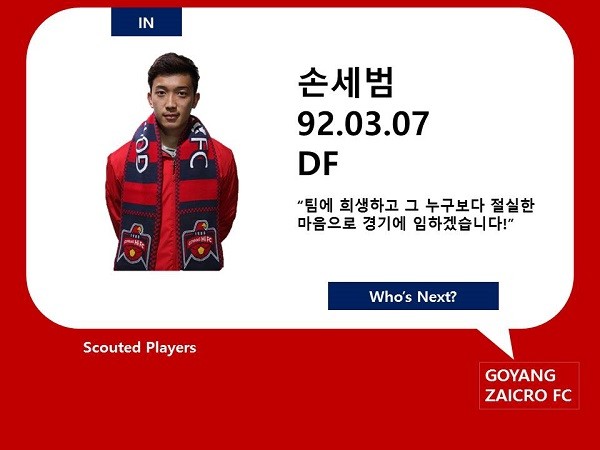 손세범은 용인대학교 졸업 후 울산현대에 입단하며 기량을 인정받았고, 빠른 발과 대인 돌파를 장기로 올 시즌 고양의 측면뿐만 미드필더 지역 등의 다방면의 역할을 부여받아 공격과 수비를 오가며 고양을 책임질 예정이다.