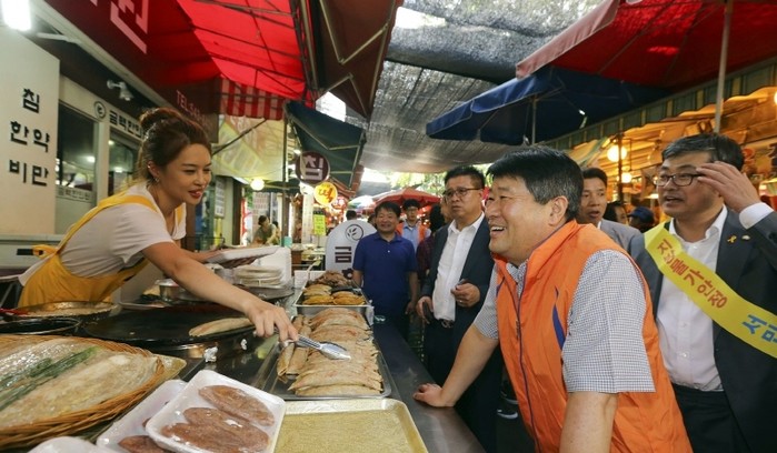 | ▲ 지역내 전통시장을 찾은 박 구청장이 시장 상인과 이야기를 나누고 있다. | ||