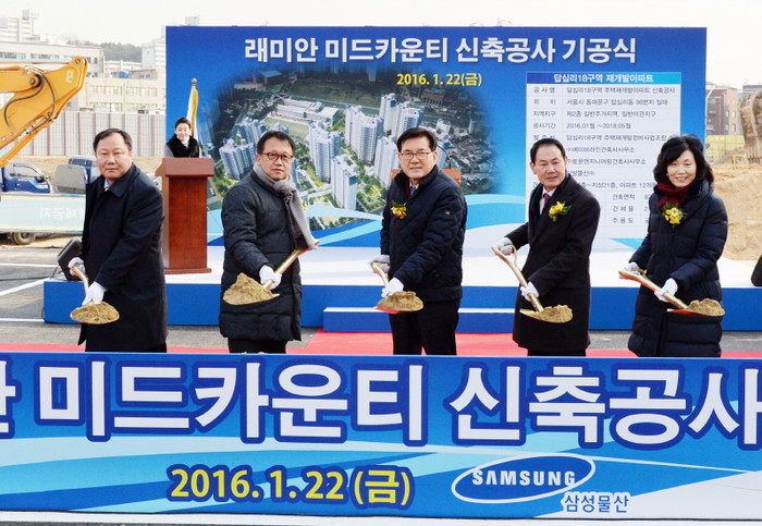 유덕열 동대문구청장(가운데)이 지난 22일 오후 2시 답십리제18구역 신축현장에서 개최된 '래미안 미드카운티 신축공사 기공식'에 참석해 내빈들과 삽으로 흙을 떠 기념촬영을 하고 있다.(사진제공=동대문구청)