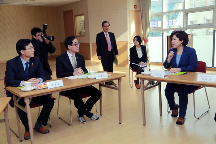 지난 22일 이준식 사회부총리 겸 교육부장관이 누리과정 현장 목소리를 듣기 위해 서초구 반포동에 위치한 '구립 하나푸르니반포어린이집'을 방문했다. 사진은 조은희 구청장, 이 장관, 방문규 보건복지부 차관(오른쪽부터)의 모습.(사진제공=서초구청)