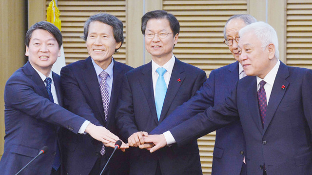 25일 서울 여의도 국회 의원회관에서 열린 국민의당-국민회의 통합발표 기자회견을 마친 안철수(왼쪽부터) 국민의당 인재영입위원장, 한상진 공동창당준비위원장, 천정배 국민회의 창당준비위원장, 윤여준 국민의당 공동창당준비위원장, 김한길 상임부위원장이 취재진을 향해 포즈를 취하고 있다.