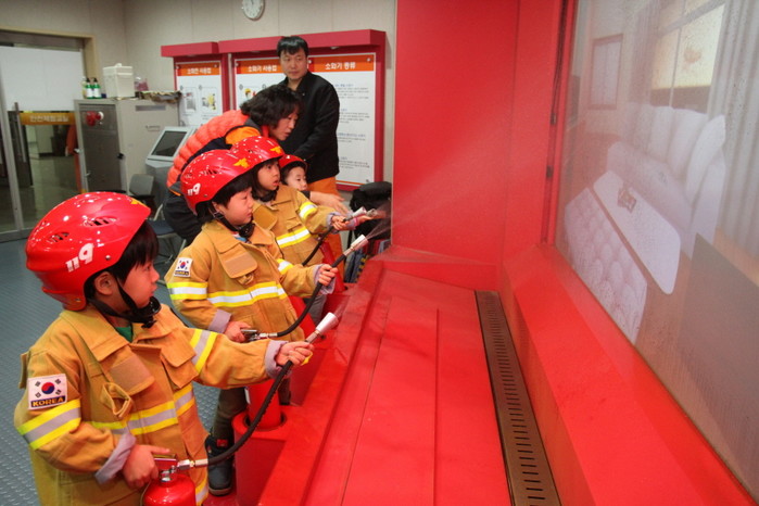 지난 25일 서울 동작소방서는 소방안전체험교실에서 동아유치원 어린이 25명에게 소방안전교육을 실시했다. 사진은 교육에 참석한 어린이들이 소화기 사용 실습을 하는 모습.(사진제공=동작소방서)