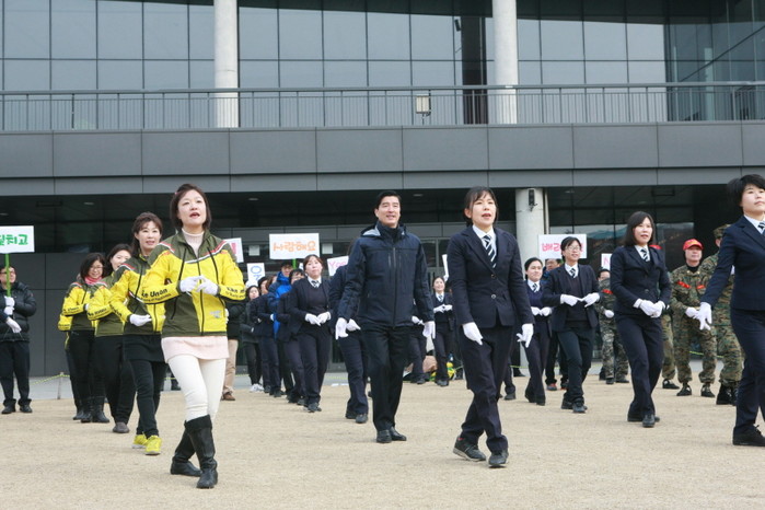 최근 이해식 서울 강동구청장은 강동아트센터에서 열린 '배려 교통문화 실천 운동 - SOS 1000만명 릴레이 캠페인'에 참석했다. 사진은 이 구청장(가운데)과 관계자들이 캠페인송에 맞춰 수신호 댄스를 추는 모습.(사진제공=강동구청)
