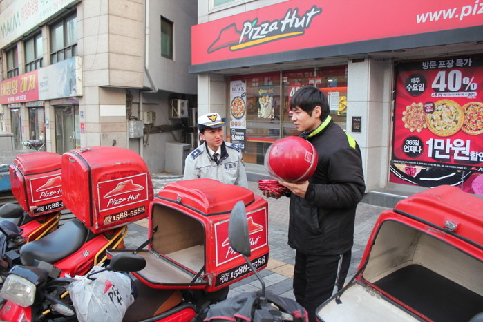 지난 27일 인천 중부경찰서는 동인천 일대 이륜차 운영업소를 방문해 운전자·운영자를 대상으로 안전운행을 위한 교통안전 홍보와 함께 인도주행금지 스티커를 부착하는 캠페인을 실시했다.(사진제공=중부경찰서)