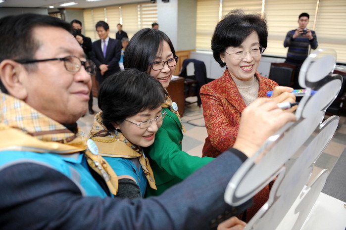 지난 27일 송파구는 구청 대회의실에서 '2016 자율방재협의회 정기총회 및 안전리더교육'을 개최했다. 사진은 행사에 참석한 박춘희 구청장(오른쪽)이 '안전다짐서약'을 작성하는 모습.(사진제공=송파구청)
