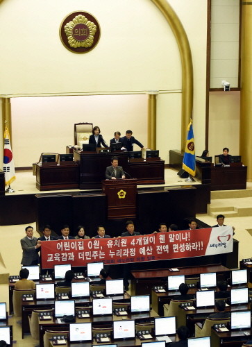 28일 오전 수원시 경기도의회 본회의장에서 열린 306회 임시회 본회의에서 새누리당 의원들이 누리과정 예산 편성과 관련해 현수막을 펼치고 있다. 도의회는 임시회에서 유치원 누리과정 예산을 포함한 도와 도교육청의 본예산을 처리하며 도교육청의 준예산 사태는 28일 만에 종식됐다.