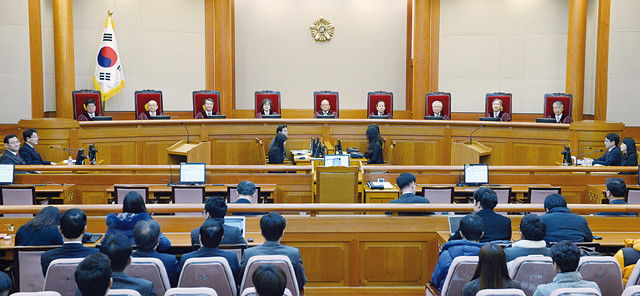 박한철 헌법재판소장을 비롯한 재판관들이 28일 오후 헌법재판소 대심판정에 자리하고 있다. 이날 열린 국회선진화법 권한쟁의에 대한 공개변론에서는 국회선진화법이 ‘과반 출석, 출석 과반 찬성’이라고 의결 정족수를 규정한 헌법 조문에 위배되는지가 가장 큰 쟁점이 될 것으로 보인다.