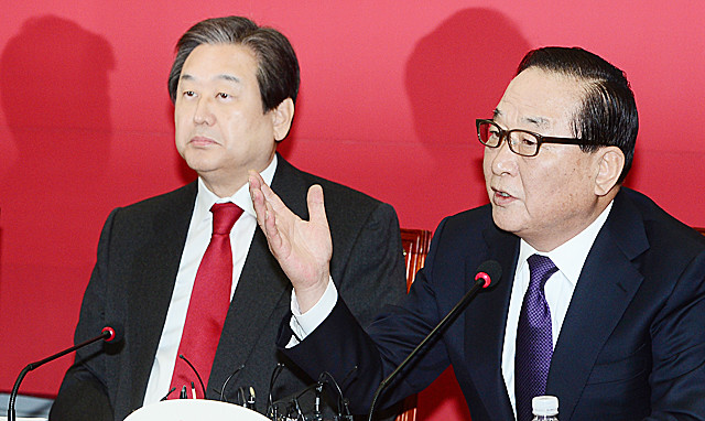 28일 오전 서울 여의도 국회에서 열린 새누리당 최고위원회의에서 서청원 최고위원이 김무성 대표가 지난 2012년 일명 ‘국회선진화법’의 입법에 당시 ‘권력자’이던 박근혜 대통령의 찬성이 큰 역할을 했다는 취지의 발언을 한 데 대해 “왜 이런 발언을 해서 분란을 일으키느냐”고 비판하고 있다.